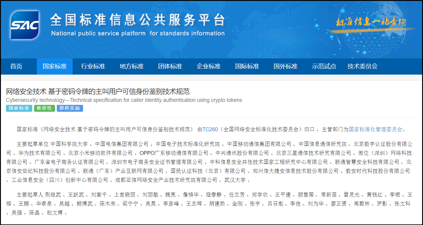 近日,國(guó)家市場(chǎng)監(jiān)督管理總局(國(guó)家標(biāo)準(zhǔn)化管理委員會(huì))印發(fā)2024年第6號(hào)中國(guó)國(guó)家標(biāo)準(zhǔn)公告,其中GB/T 43779-2024 《網(wǎng)絡(luò)安全技術(shù) 基于密碼令牌的主叫用戶(hù)可信身份鑒別技術(shù)規(guī)范》(簡(jiǎn)稱(chēng)可信通信CHAKEN標(biāo)準(zhǔn))正式發(fā)布,于2024年11月1日正式實(shí)施。該標(biāo)準(zhǔn)填補(bǔ)了國(guó)內(nèi)可信通信服務(wù)的空白,規(guī)定了基于密碼令牌在通信中傳輸、驗(yàn)證和顯示主叫用戶(hù)可信身份的技術(shù)規(guī)范,為網(wǎng)絡(luò)參與者提供身份識(shí)別與驗(yàn)證,可為解決通信身份仿冒和騷擾問(wèn)題,從源頭上遏制電信網(wǎng)絡(luò)詐騙高發(fā)態(tài)勢(shì)提供一種正向解決途徑。