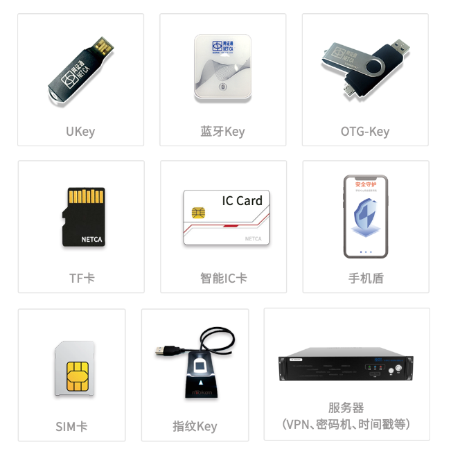 網(wǎng)證通CA的證書介質(zhì)形態(tài)多樣如下圖1所示,可以滿足不同場(chǎng)景的應(yīng)用。具體如下: