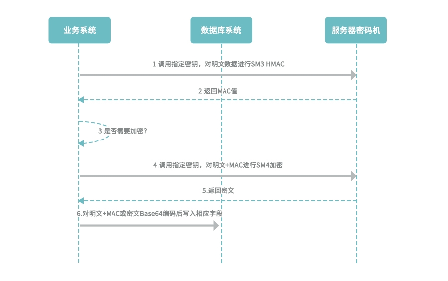 1. 業務系統在敏感數據寫入數據庫前,調用指定密鑰,對明文數據進行SM3 HMAC進行完整性保護;