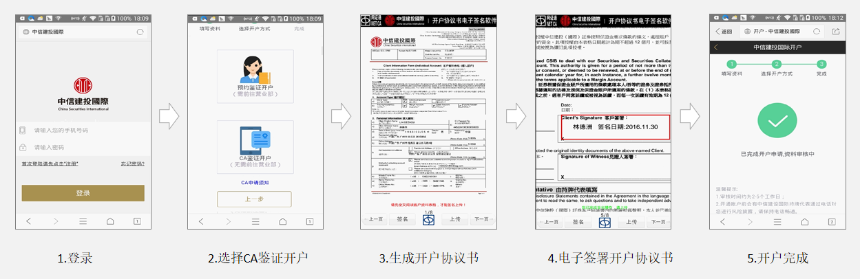 中介人于網上與客戶建立業務關系時,客戶可使用具備粵港證書互認資格的CA機構簽發的數字證書進行客戶協議的電子簽署,與書面文件上的簽名具有同等法律效力,辦理香港及海外市場的開戶。