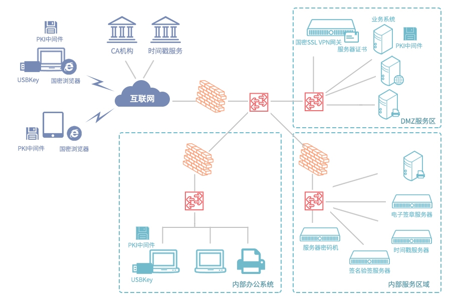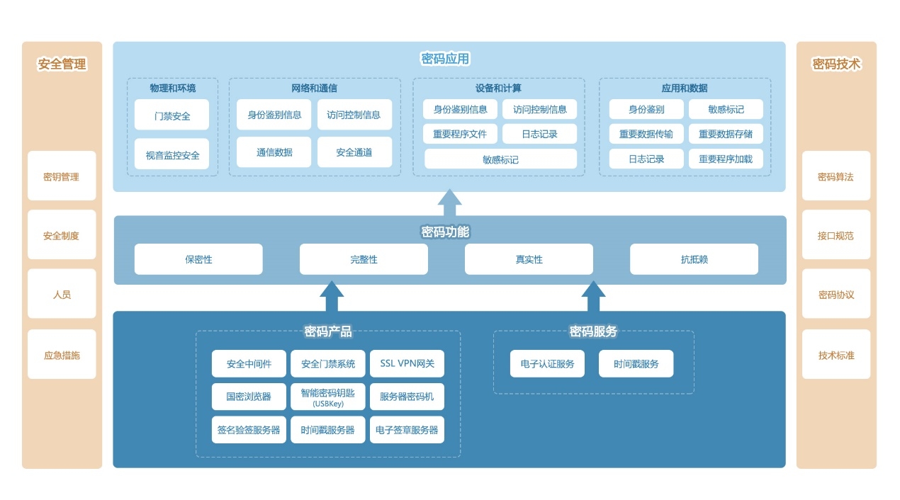 3.系統改造與集成方面,依賴以上密碼產品和密碼服務,通過合規的密碼技術進行系統集成和改造,解決物理和環境、網絡和通信、設備和計算、應用和數據的數據和傳輸的保密性、完整性問題,身份真實性問題和操作行為的抗抵賴問題;